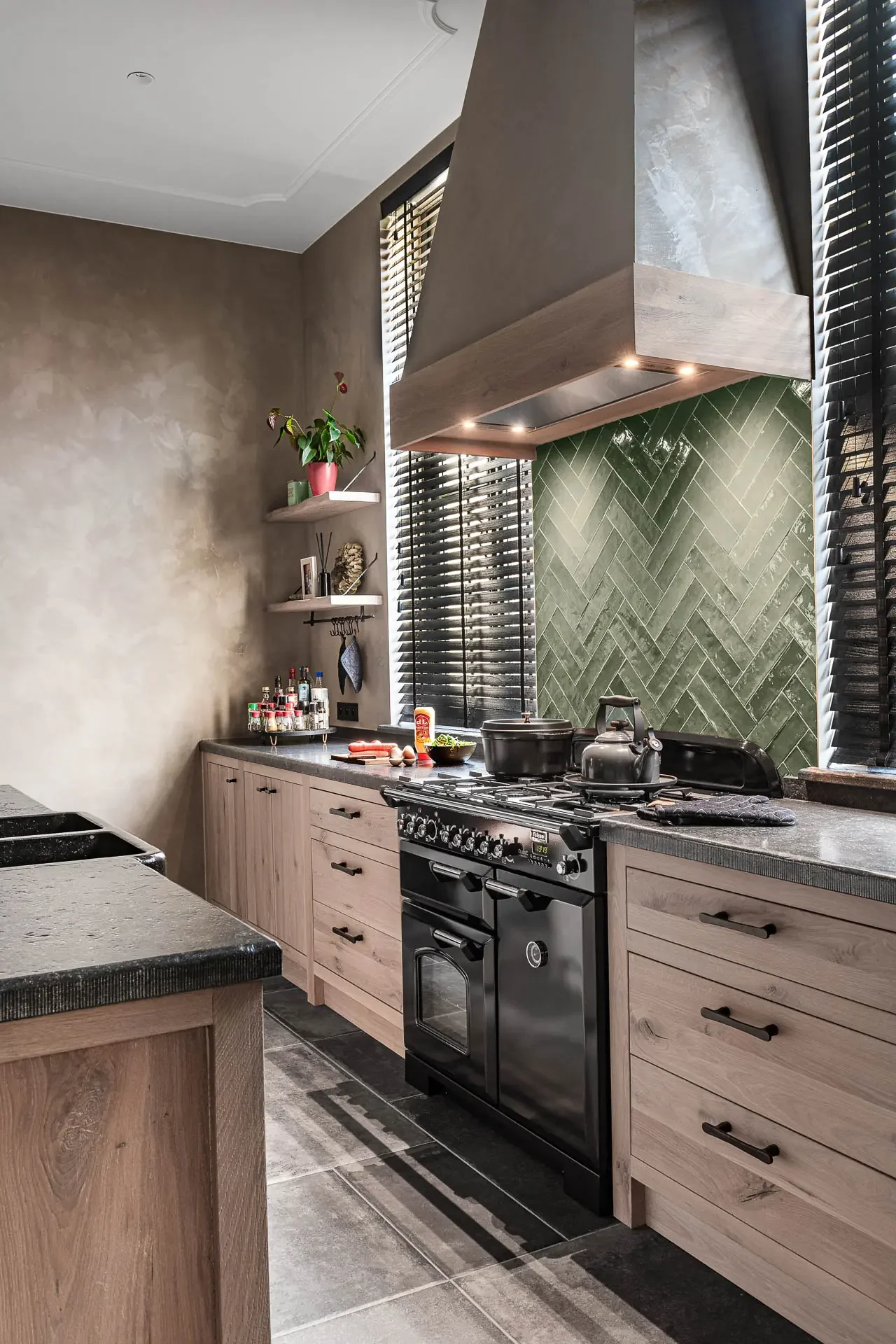 De keuken vormt het kloppend hart van de woning. Hier smelten natuurlijke materialen, zachte kleuren en robuuste elementen samen tot een harmonieus geheel. Het eiken maatwerk wordt gecombineerd met een arduinen werkblad, messing kranen en zwart ijzeren beslag. Een stoer fornuis vormt het centrale punt, terwijl olijfgroene zelliges zorgen voor een warme en unieke toets. De kleurkeuze werd verder doorgetrokken in de stoelen, sofa en accessoires, wat voor rust en eenheid zorgt.
